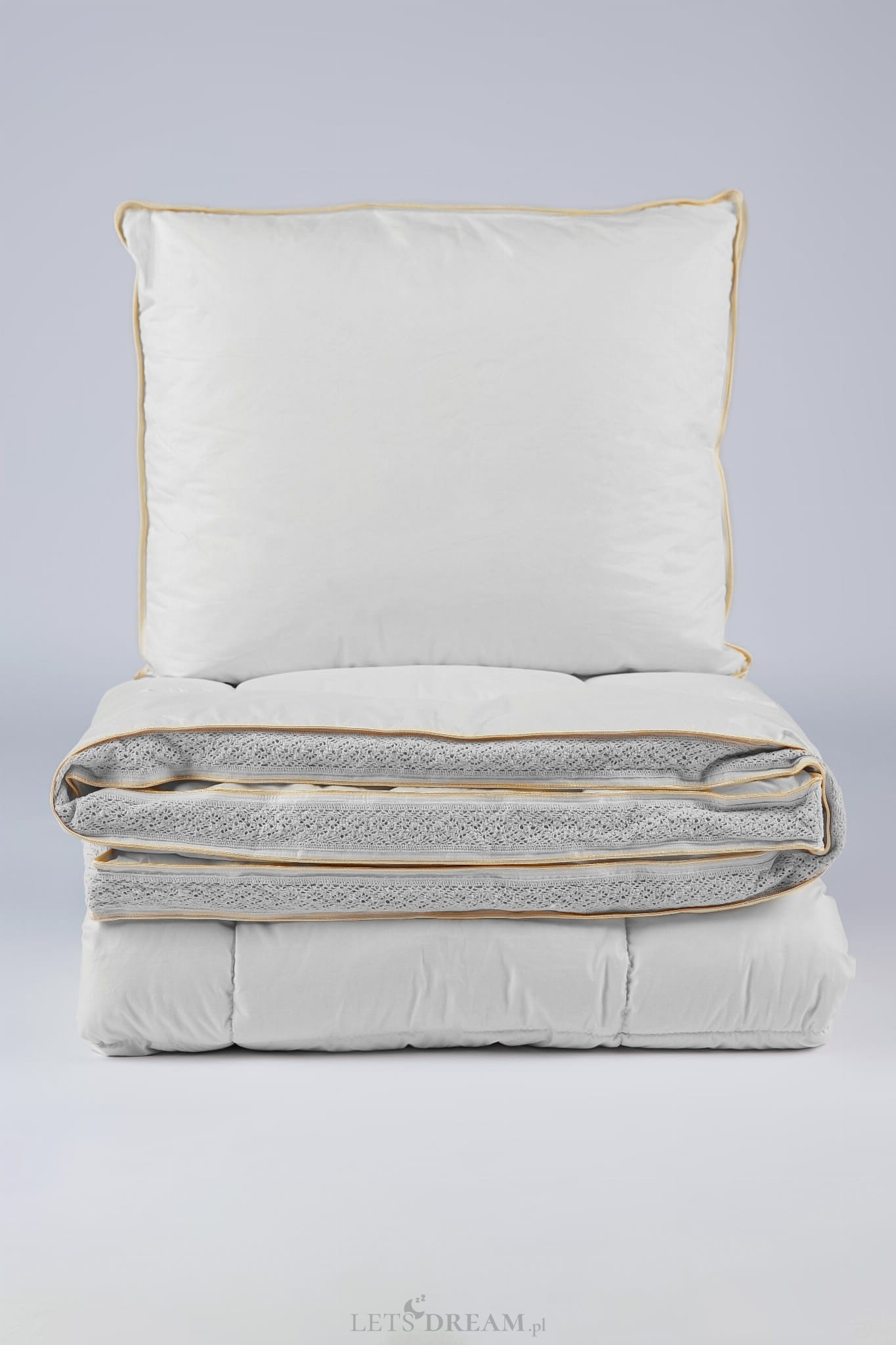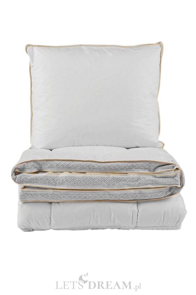 Ekskluzywna linia produktów pościelowych z doskonałej klasy wypełnieniem puchowym, starannie wyselekcjonowanym i otrzymywanym tylko w określonym okresie w roku. Elegancka kolekcja puchowa, uniwersalna, idealna dla spokojnego i przyjemnego snu. Wypełnienie składające się z odpowiednio sortowanego puchu gwarantuje niezapomniane doświadczenie snu, lekkość, ciepło oraz niezwykłą delikatność. Pokrycie tej luksusowej kolekcji wykonane jest z puchoszczelnego, szlachetnego materiału w delikatnym odcieniu bieli. Uwieńczeniem produktu jest ścianka boczna ozdobiona elegancką szydełkową koronką w kolorze materiału oraz ekskluzywna podwójna złota lamówka, która nadaje produktom szczególnie luksusowy wymiar, podkreślając wysoką klasę wyrobu oraz dokładność i technikę wykonania.