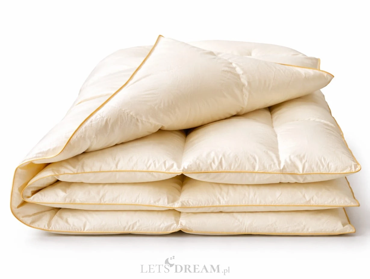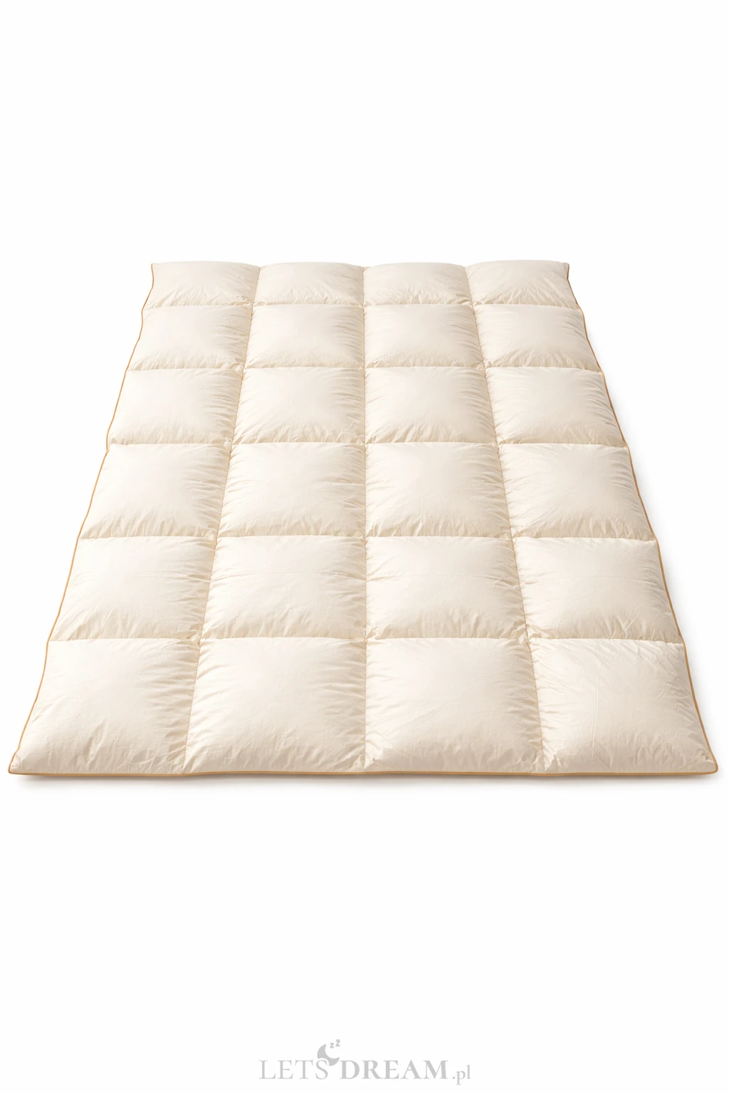 Kołdry wykonane są w systemie kasetonowym, który zapewnia równomierne rozmieszczenie wypełnienia w oddzielnych komorach. Dzięki temu puch nie przemieszcza się wewnątrz produktu, a na całej powierzchni utrzymywana jest jednolita warstwa izolacyjna. Konstrukcja kasetonowa eliminuje ryzyko powstawania tzw. zimnych stref, gwarantując wysoki komfort cieplny podczas snu.