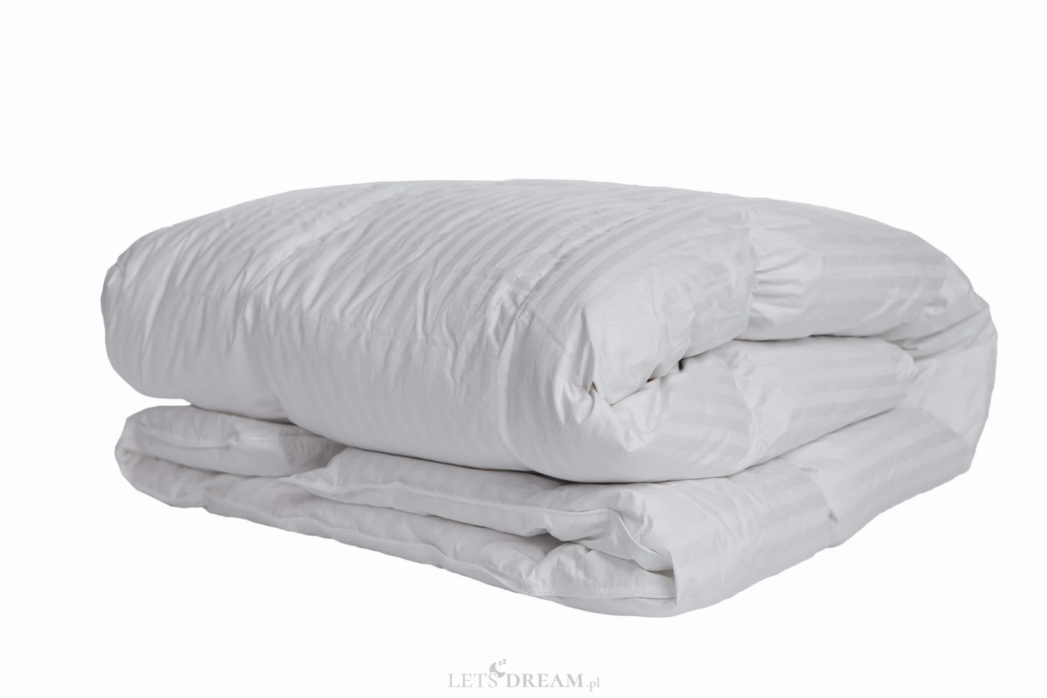 Wypełnienie – Biały Puch Gęsi, odpowiednio przygotowany zgodnie z Normami Europejskimi, Certyfikowany wg Oeko-Tex Standard 100. Dzięki zastosowaniu tak wysokiej jakości puchu, kołdry są wyjątkowo ciepłe nawet przy niskiej wadze wypełnienia. Puch gęsi charakteryzuje się wyjątkowymi właściwościami termicznymi, higroskopijnymi (absorbuje wilgoć), zapewnia przyjemną dla organizmu naturalność i delikatność. Puch Gęsi wypełniający kołdry i poduszki pobiera z otoczenia powietrze, a następnie utrzymuje je w pustych obszarach swoich promieni – zapewnia 100% odpowiedniej cyrkulacji powietrza dla organizmu ludzkiego, jakże istotnego podczas snu. Kołdra okrywająca ciało ludzkie gwarantuje ponadprzeciętną ochronę cieplną, nie powodując przy tym przegrzania organizmu. Kasetonowa konstrukcja kołder zapobiega powstawaniu zimnych stref, ponieważ wypełnienie pozostaje równomiernie rozłożone na całej powierzchni. Natomiast poduszki umożliwiają odpowiedni opływ powietrza wokół głowy, dzięki czemu budzimy się wypoczęci i odprężeni. Poszycie użyte w najnowszej kolekcji, które stanowi jedwabiście gładka, higieniczna i delikatna w dotyku bawełna z delikatnymi paskami w kolorze bieli. Zastosowany materiał poszycia – 100% bawełna - zapewnia doskonały termoobieg powietrza, dzięki czemu użyte wypełnienie zachowuje wszystkie swoje właściwości przez bardzo długi czas.