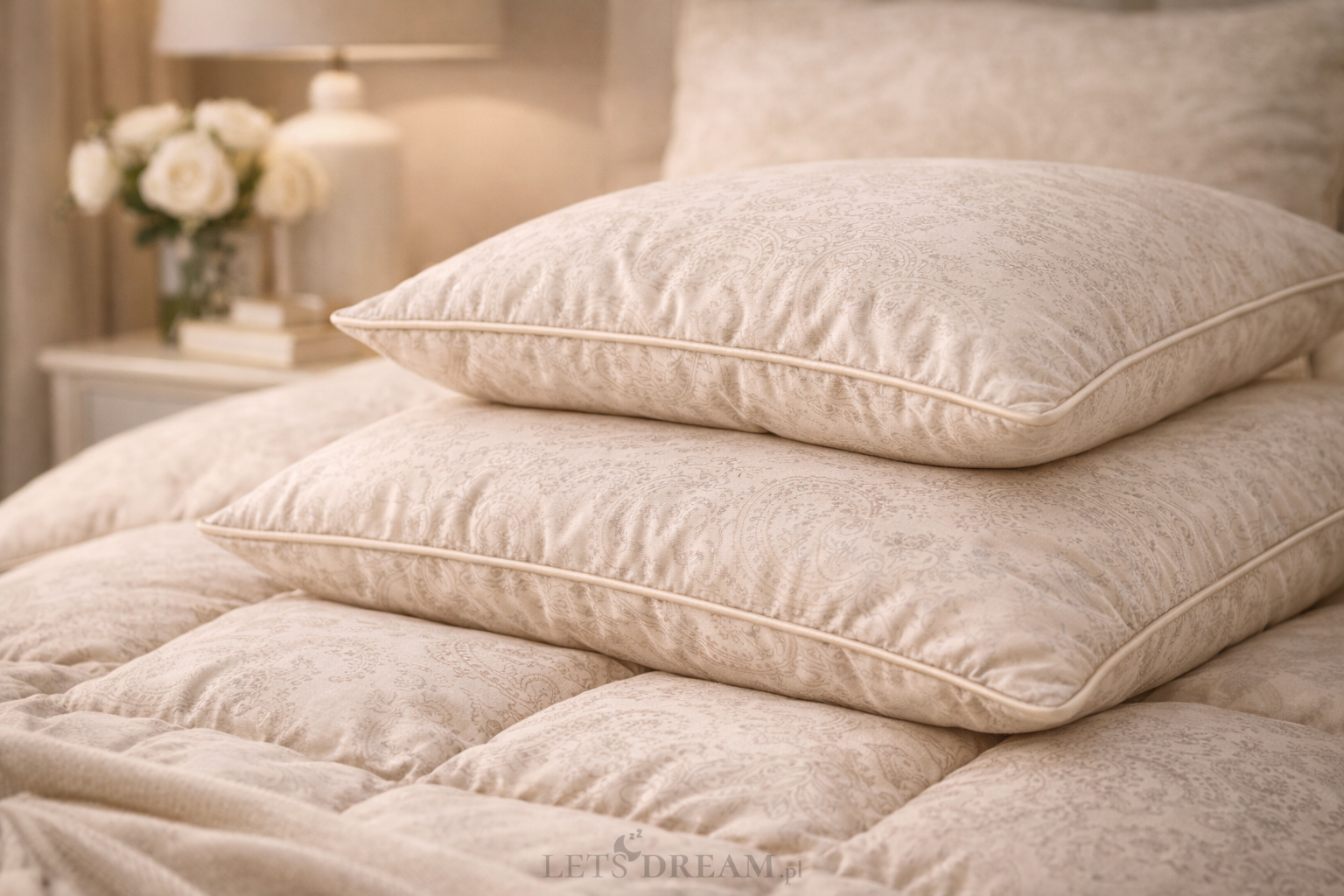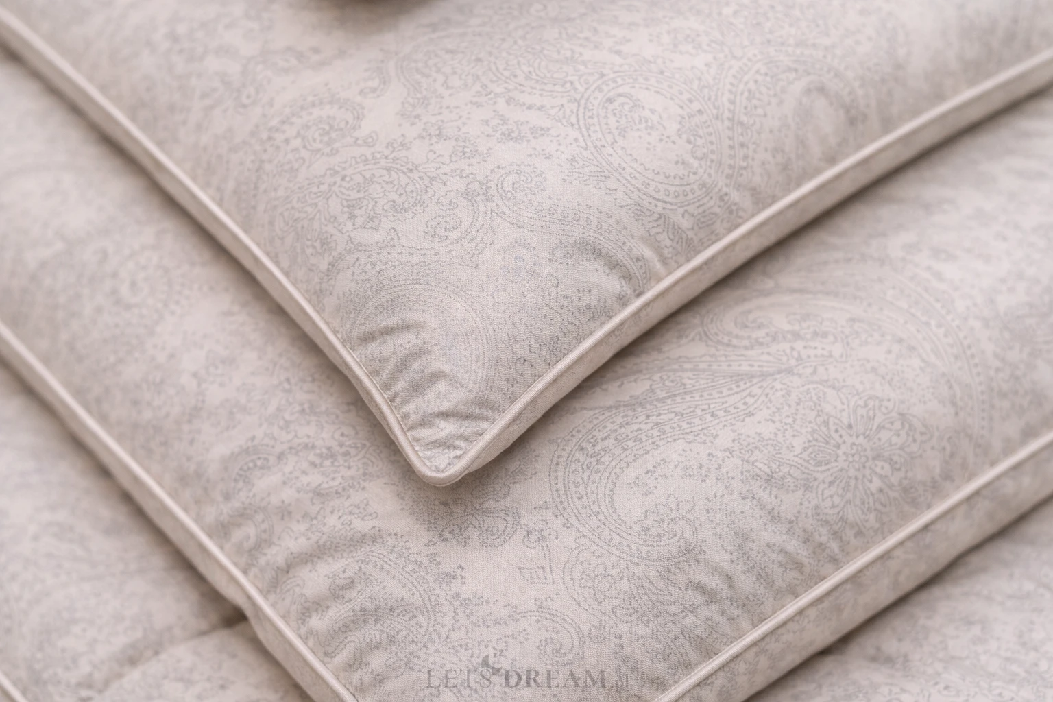 Poszycie najnowszej kolekcji stanowi luksusowy, elegancki, puchoszczelny jedwab z delikatnym wzorem, wykonany z najwyższą precyzją i dbałością o każdy detal. Jedwabne poszycie jest bardzo delikatne, gładkie, miłe w dotyku i doskonale reguluje temperaturę ciała.