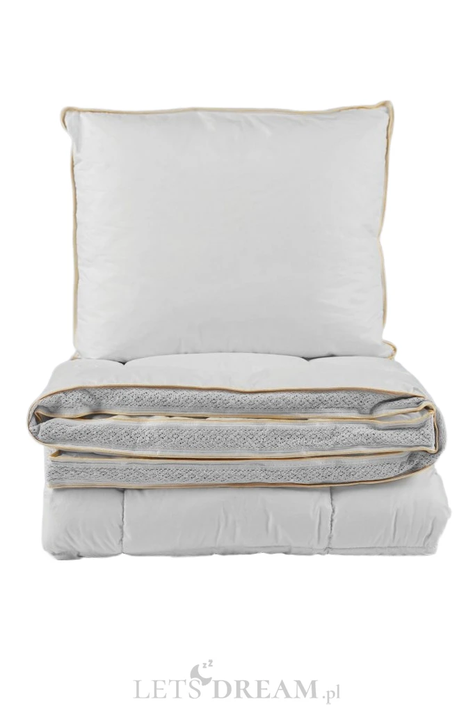 Ekskluzywna linia produktów pościelowych z doskonałej klasy wypełnieniem puchowym, starannie wyselekcjonowanym i otrzymywanym tylko w określonym okresie w roku. Elegancka kolekcja puchowa, średnio ciepła, uniwersalna, idealna dla spokojnego i przyjemnego snu. Wypełnienie składające się z odpowiednio sortowanego puchu gwarantuje niezapomniane doświadczenie snu, lekkość, ciepło oraz niezwykłą delikatność. Pokrycie tej luksusowej kolekcji wykonane jest z puchoszczelnego, szlachetnego materiału w delikatnym odcieniu bieli. Uwieńczeniem produktu jest ścianka boczna ozdobiona elegancką szydełkową koronką w kolorze materiału oraz ekskluzywna podwójna złota lamówka, która nadaje produktom szczególnie luksusowy wymiar, podkreślając wysoką klasę wyrobu oraz dokładność i technikę wykonania.